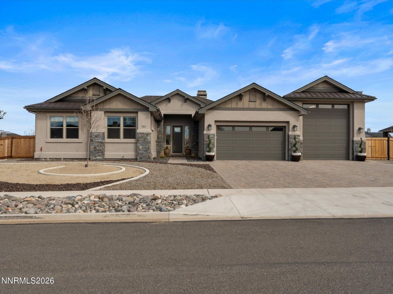 Quality-built custom home in Rain Shadow Estates featuring high-end finishes, thoughtful design, and extensive upgrades throughout. Situated on over half an acre, this property offers a spacious setting with room for additional improvements while maintaining a clean, well-designed landscape. The exterior showcases stucco construction with natural stone accents, a paver driveway, and professionally designed landscaping that complements the surrounding mountain setting. The backyard features an extended paver patio with a custom heart-shaped design, open sky views, and ample space for future additions such as a large lap pool, detached garage, or expanded outdoor living area. Inside, the home features European burnt oak hardwood flooring, upgraded hand-troweled wall texture, custom cabinetry, and built-in storage in the great room surrounding a natural stone fireplace. The open layout offers comfortable living spaces with attention to detail throughout. The kitchen is well appointed with quartz countertops, tile backsplash, double ovens, built-in refrigerator, upgraded appliances, a large walk-in pantry, and generous workspace for cooking and entertaining. A spacious laundry room provides additional storage and functionality. Bathrooms include upgraded tile finishes consistent with the quality found throughout the home. Garage space is exceptional, featuring a finished 44-foot deep RV garage in addition to an oversized two-car garage, along with additional RV parking on the side of the home. The garage also includes custom built-in cabinetry, water softener system, and an extensive whole-home generator installed in 2026. The floor plan offers excellent separation of living areas, with a private primary suite and additional bedrooms positioned for flexibility of use. Located in Rain Shadow Estates, this property offers custom construction, upgraded materials, generous lot size, and a newer custom home setting in the Carson Valley area.